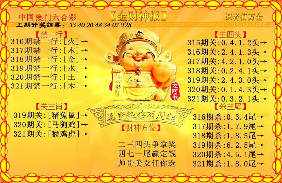 | 320期:内幕①肖+三中三开:虎28准 内幕①肖:【虎】 三中三:【20-33-07】 |