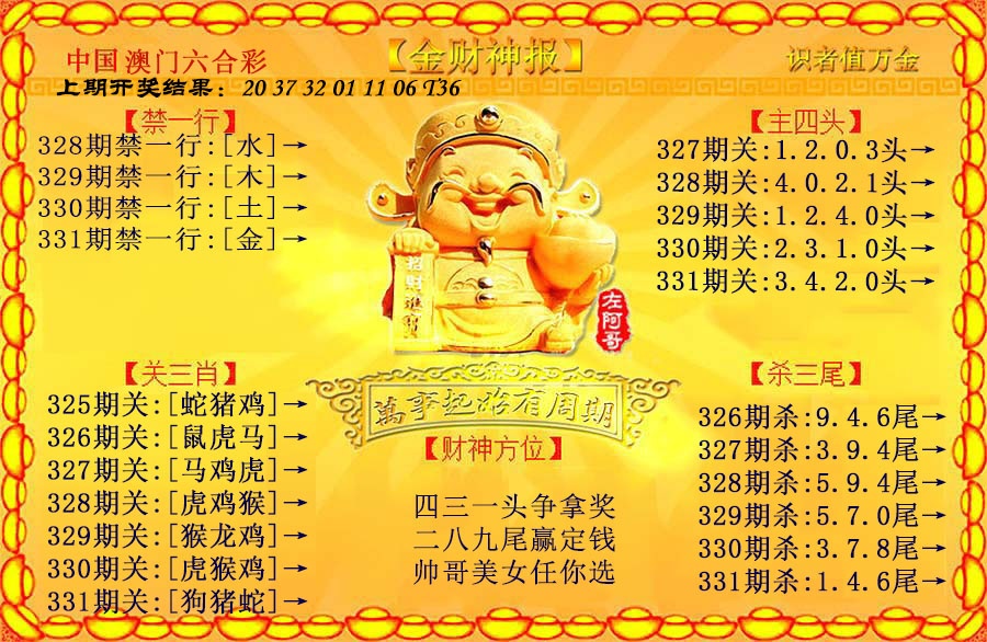 | 330期:内幕①肖+三中三开:马36准 内幕①肖:【马】 三中三:【11-32-20】 |